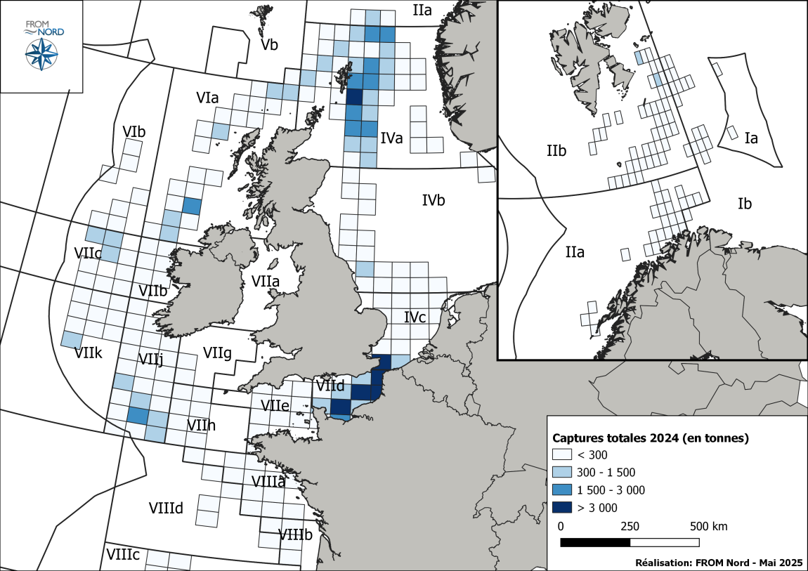 D'autres zones sont également fréquentées, à savoir la zone IVa (zone de pêche des armements hauturiers), mais aussi les zones autour du Royaume-Uni et de l'Irlande, en particulier la mer Celtique.